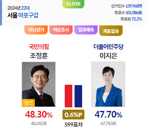 | [2024 국회의원 총선거] 인천 격전지 개표결과 (0) | 2024.04.15 |