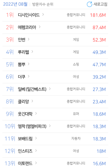 그 뒤를 루리웹, 뽐뿌, 더쿠 등이 순위를 잇고 있다.