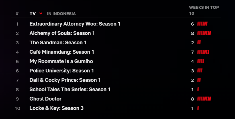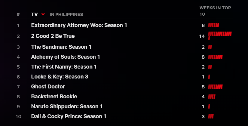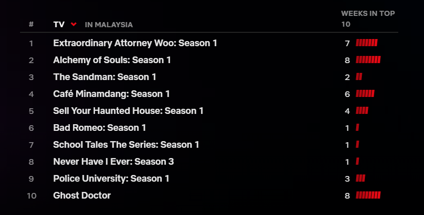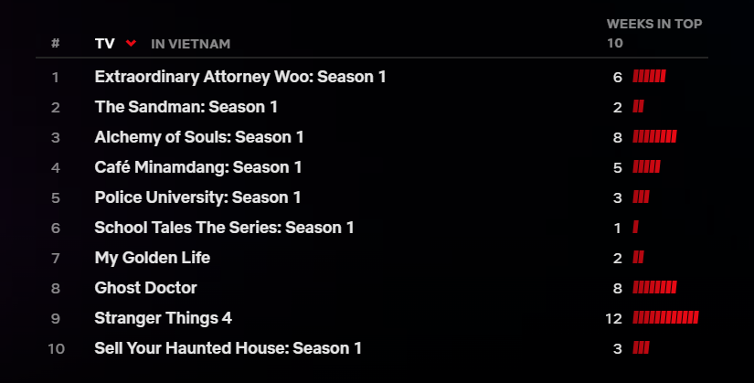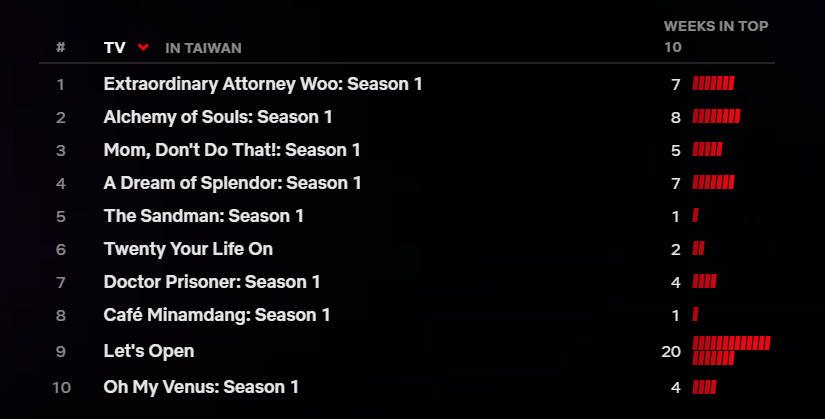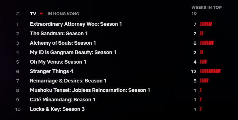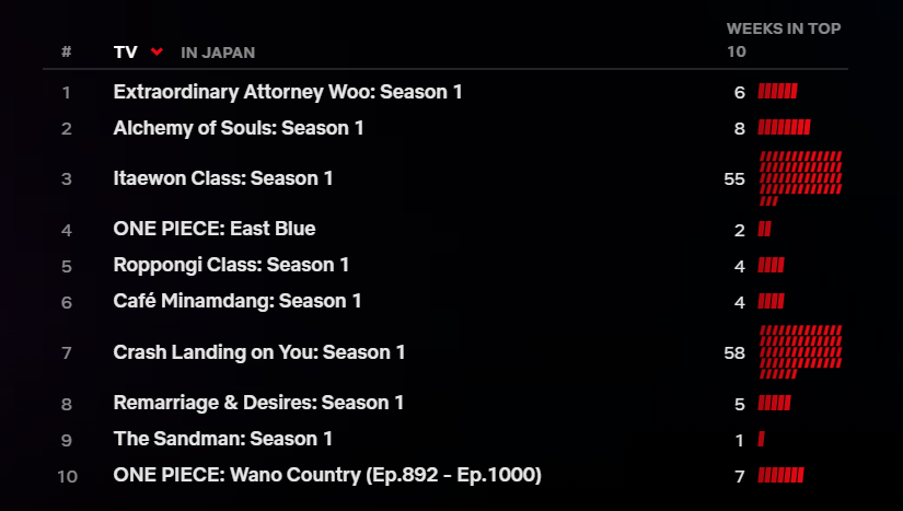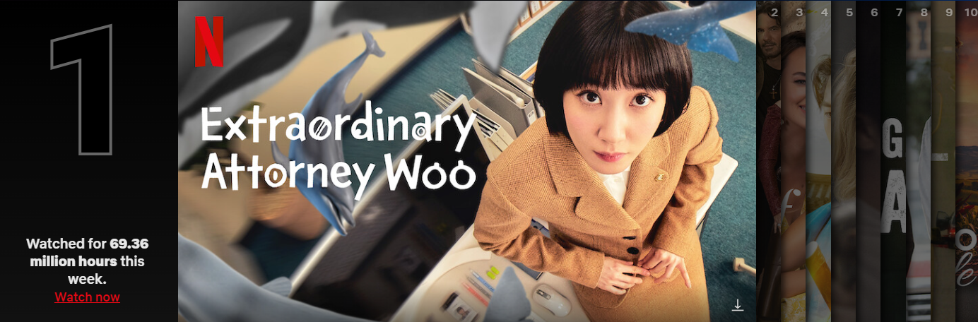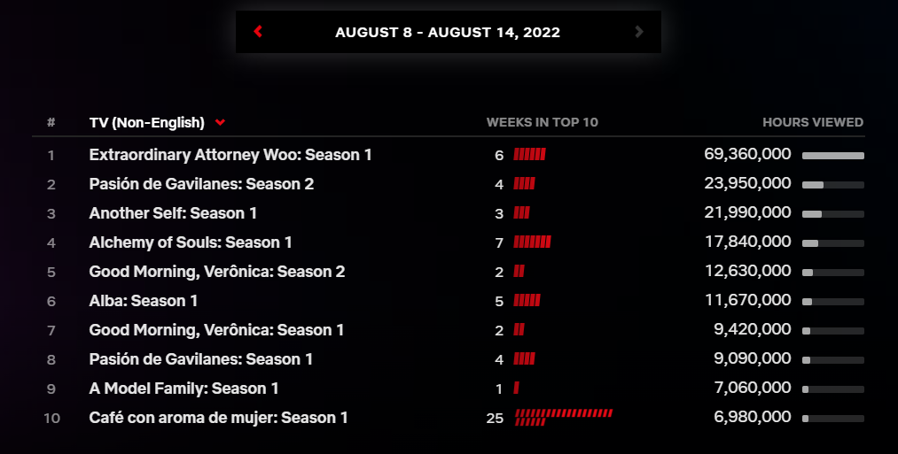 ENA 수목드라마 "이상한 변호사 우영우"가 8월 2주차(8/8~8/14) 넷플릭스 전세계 비영어 TV 차트에서 1위를 기록하였다.